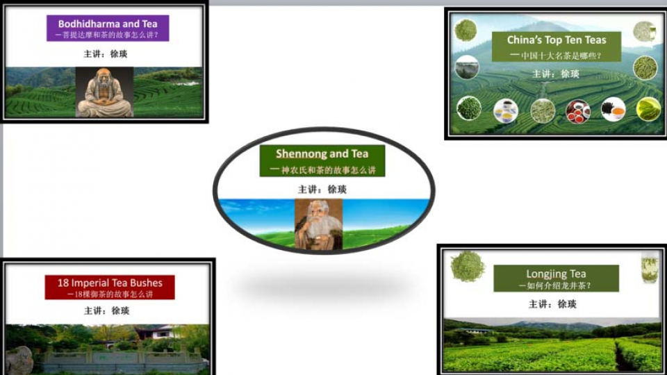 一、主要内容 《茶》的系列微课旨在帮助那些即将从事导游行业的学员或者旅游英语爱好者快速学习如何用英语简单地讲述有关茶起源的三种传说:神农氏和茶的故事,菩提达摩和茶的故事,乾隆皇帝和十八棵御茶的故事。同时,也帮助学生方便快捷地了解中国十大名茶和龙井茶的主要特征。 二、教学设计的主要特色 1. 利用各种应景图片进一步帮助再现故事情景或加以说明,有助于学员的理解和记忆。 2. 中英文讲解,语言亲切自然,循循善导,加强互动。 3. 清晰地标出中英文关键词,方便不同层次的英语爱好者学习。